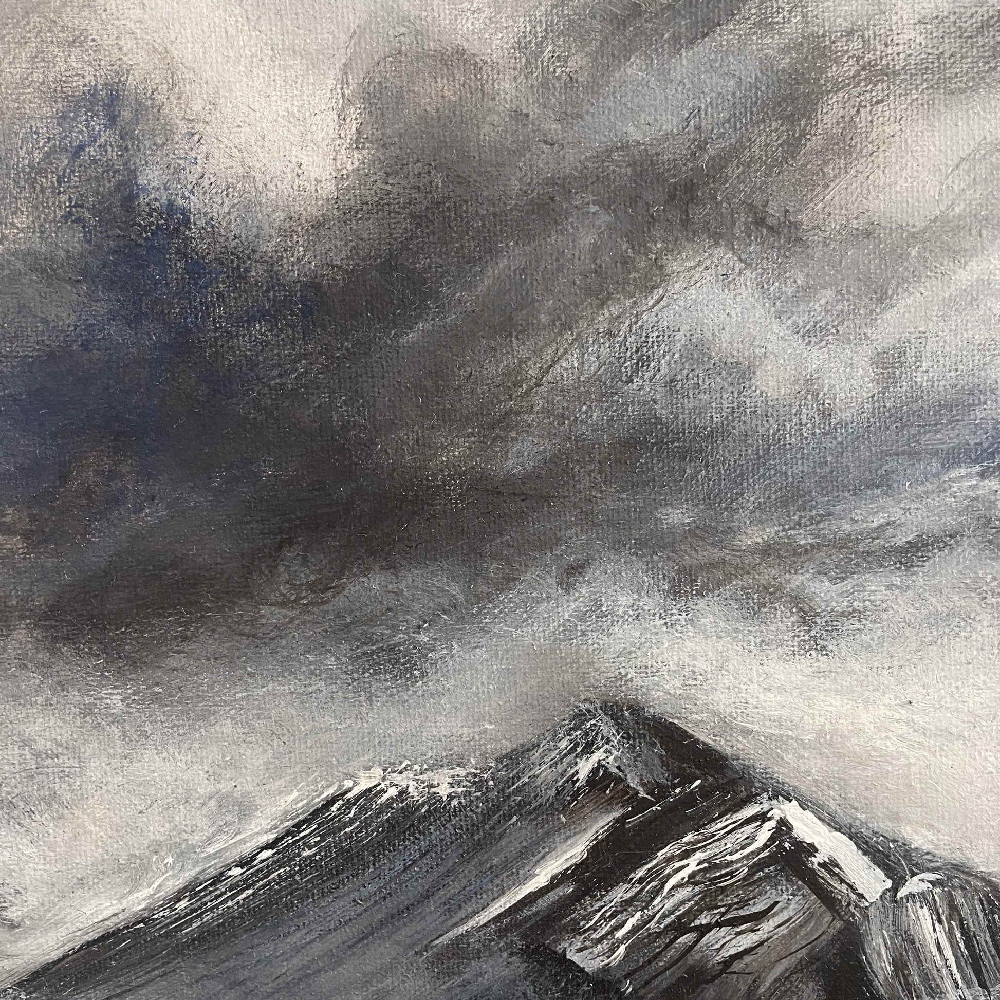 Mein Vater hat uns Kindern schon in jungen Jahren die Leidenschaft für Kreativität eingeflößt. Was wir erkunden konnten, erkundeten wir und er war immer da, um mit uns zu bauen und uns zu unterstützen. Dieses Gemälde spiegelt die Inspiration wider, die ich durch meinen Vater erhielt. Es repräsentiert mein künstlerisches Wachstum und die Fähigkeiten, die ich im Laufe der Jahre verfeinert habe. Die sanfte, gedämpfte Farbpalette, soll die Stärke und Kraft vermitteln, unterstrichen durch die Textur des Gemäldes, die aus Acrylfarbe gefertigt wurde. Die Berge, die aus der Wolkendecke hervorbrechen symbolisieren, die einschneidenen Momente im Leben und wie sie aussehen vereinen sie sich zu einem harmonischen Ganzen.
