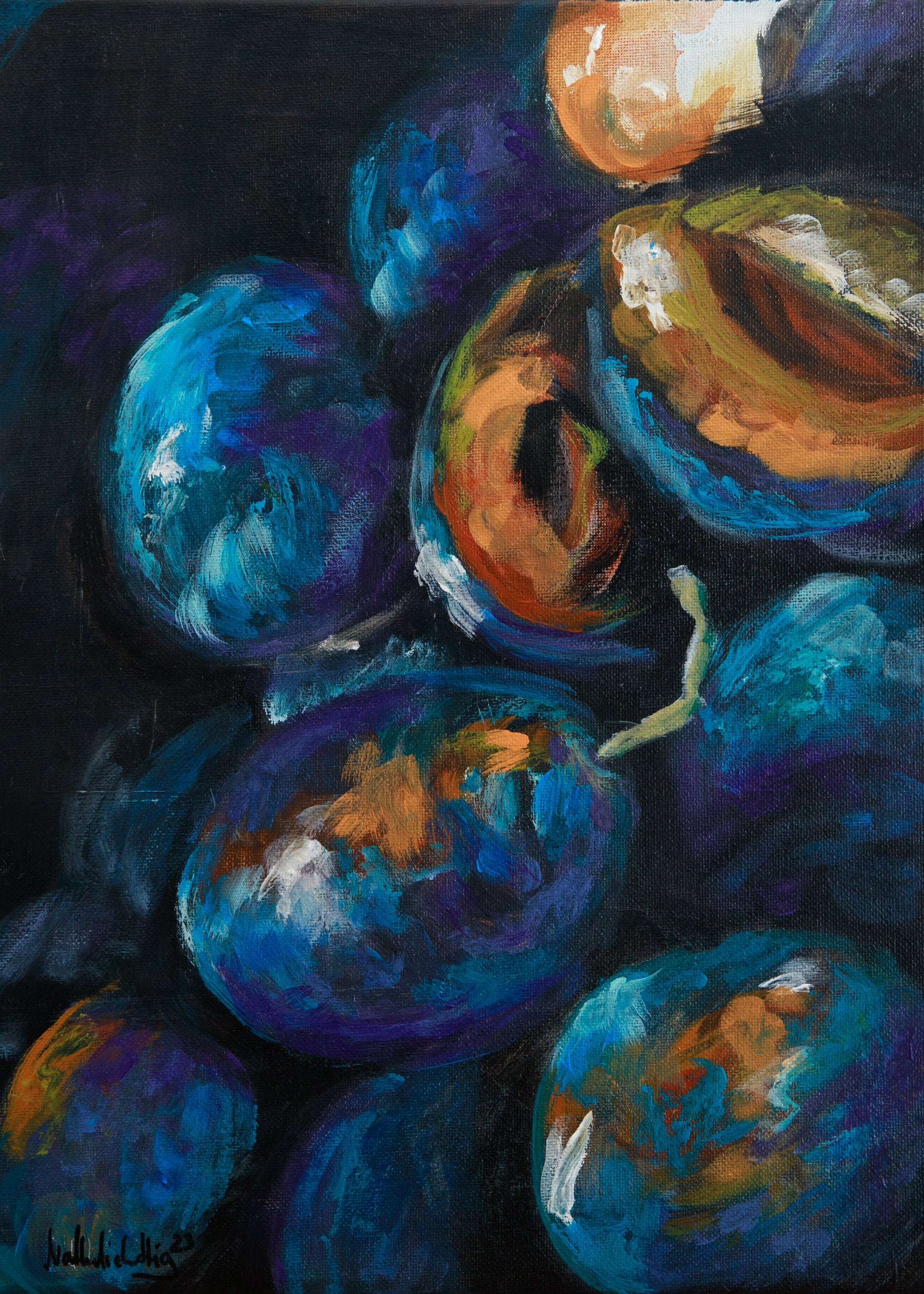 Die Farben in „Zwetschge“ stehen im Kontrast zu einander und sind ein Farbenfest für das Auge. So unterschiedlich die Farben auch sind bilden Sie gemeinsam eine Harmonie und lassen das Auge das Gemälde bis zu den Rändern erkunden. Die Wärme der Orangetöne wird durch die kühlen, klaren Farben der Schalen ausgeglichen und schafft so einen harmonischen Gegensatz, der friedlich und belebend wirken soll.